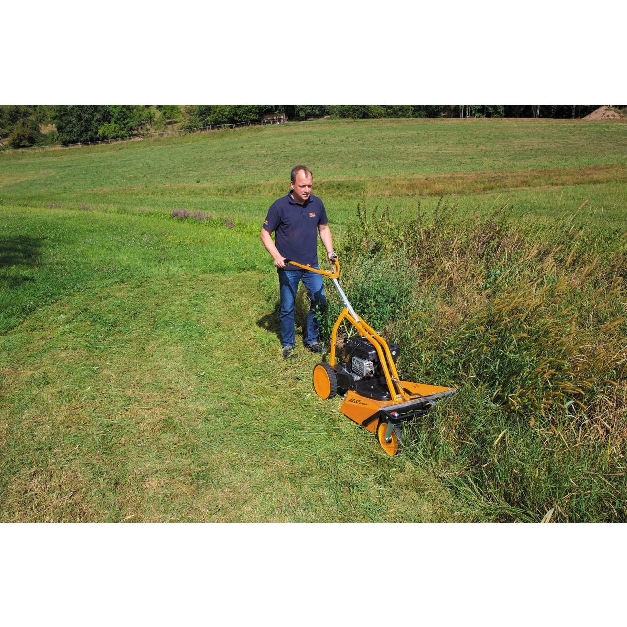 Das Kreuzmessersystem schneidet und zerkleinert zuverlässig das Schnittgut bei Schnitthöhen von 50-100 mm. Diese werden achsweise eingestellt, vorne stufenlos und hinten in fünf Stufen. Das geschlossene Mulchmähdeck mit Heckauswurf verhindert ungewolltes Auswerfen von Schnittgut zur Seite. Die Fahrgeschwindigkeit kann stufenlos während der Fahrt von 1,9 und 4 km/h variiert werden. Die 30 cm großen Antriebsräder sorgen für gute Traktion. Für Arbeit in leichten Hanglagen lassen sich die Vorderräder arretieren, um ein Abtriften der Maschine zu verhindern.