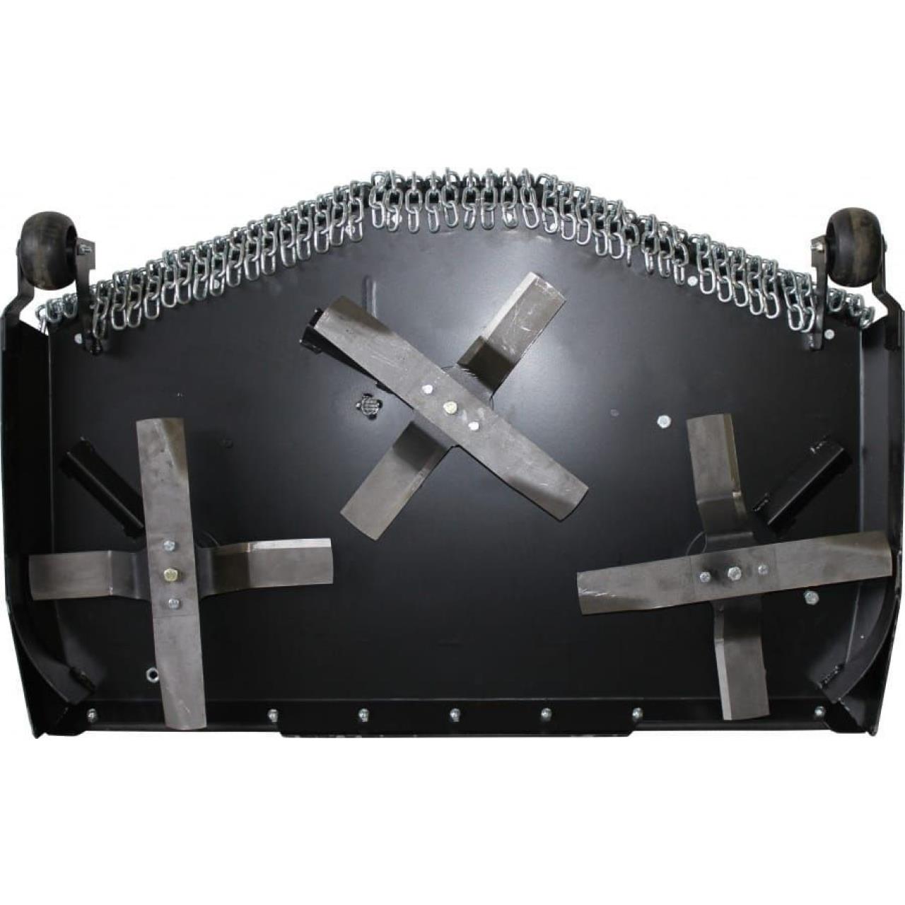 Das sehr stabil ausgelegte Mähwerk ist für die intensive Pflege bestens geeignet. Egal ob Hochgras oder regelmäßig gemähte Flächen, durch drei speziell geformte Kreuzmesser ist eine sehr gute Zerkleinerung und breitflächige Verteilung des Mähgutes gewährleistet. Durch die Konstruktion als Heckauswurfmähwerk wird die Steinschlaggefahr, wie man sie beim sonst üblichen Seitenauswurfdeck kennt, vermieden. Angeschweißte Deflektoren unter dem Mähdeck unterstützen zusätzlich die Zerkleinerung des Schnittgutes. Im Heckbereich eingesetzte Leitbleche garantieren eine sehr gute und gleichmäßige Verteilung des Schnittgutes.